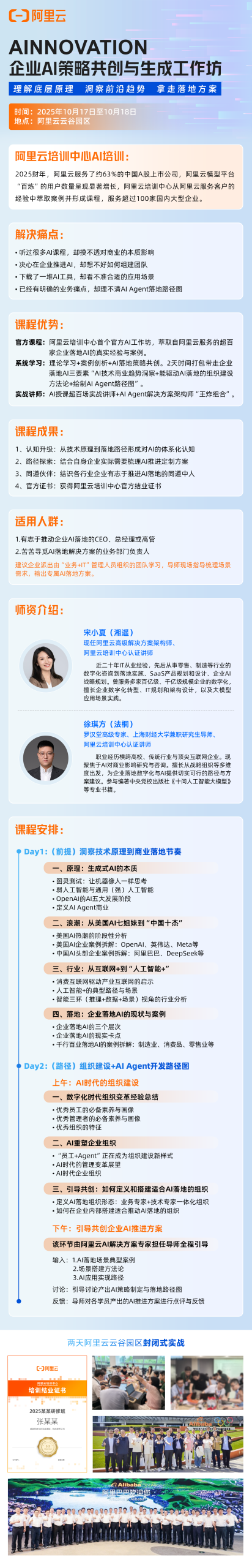 系统学习:理论学习+案例剖析+AI落地策略共创。2天时间打包带走企业落地AI三要素“AI技术商业趋势洞察+能驱动AI落地的组织建设方法论+绘制AI Agent路径图”
